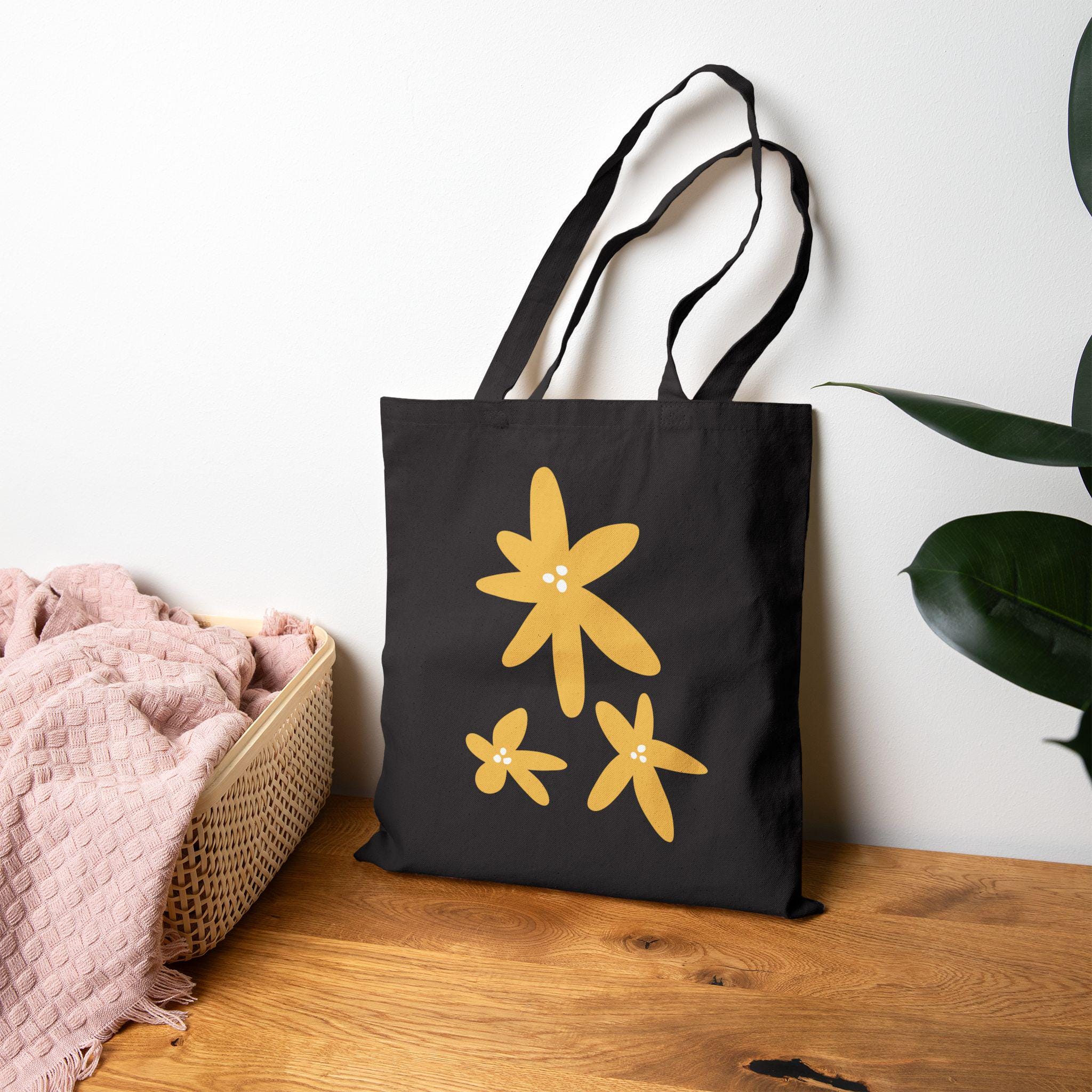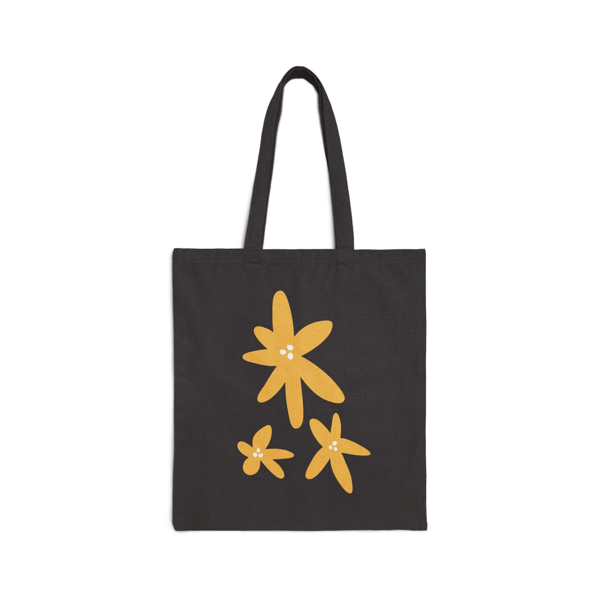 This cotton canvas tote brings a warm, hand-crafted vibe to everyday errands. The heavy 12 oz canvas holds shape and weight while flat corners keep the silhouette clean. A trio of simple, golden floral shapes adds a sunny, retro touch that feels casual and personal — like a sketch slipped into your pocket. Carry it over a shoulder or hold it by reinforced fabric handles; the sewn-in label and sturdy stitching mean it’s built to travel with you from market runs to library stops. Choose natural for a soft, organic look or black for a bold contrast.