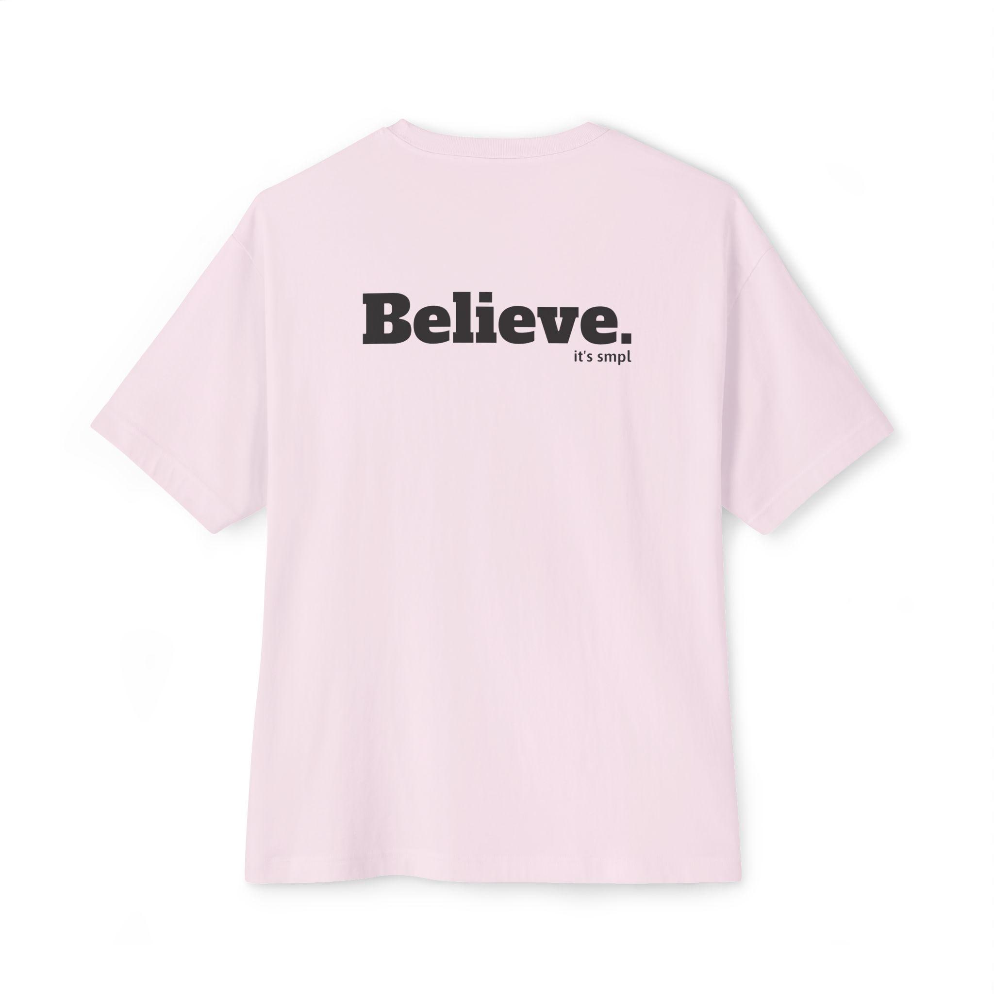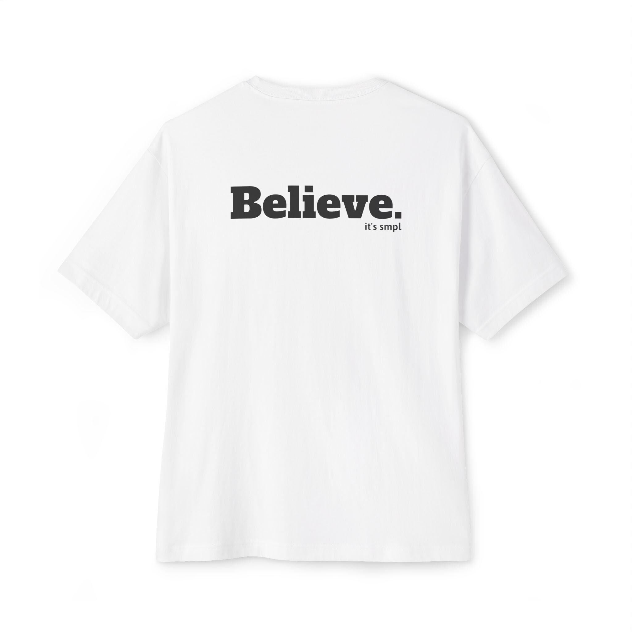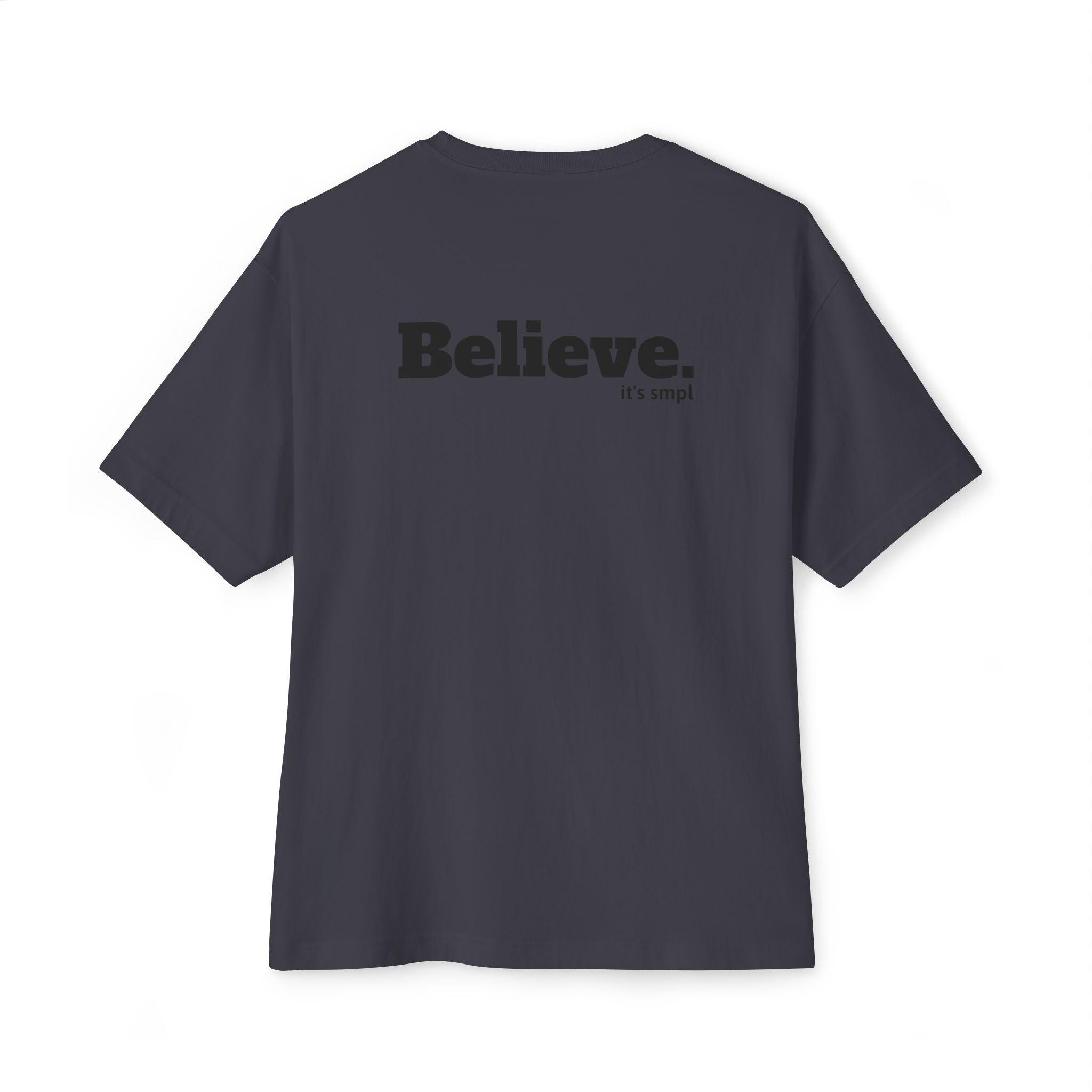 This oversized boxy tee brings quiet confidence to everyday wear. The soft, midweight cotton drapes with a relaxed silhouette and dropped shoulders for an easy, lived-in look. A tiny chest cross and bold “Believe.” across the back make a subtle, meaningful statement — wearable faith that doesn’t shout. It layers smoothly under jackets, pairs with jeans or joggers, and moves with you from slow mornings to late-night coffee runs. The tear-away label keeps the neckline smooth and comfortable, while reinforced double-needle hems hold shape through regular wear. Reach for this when you want clothing that feels calm, steady, and intentional.