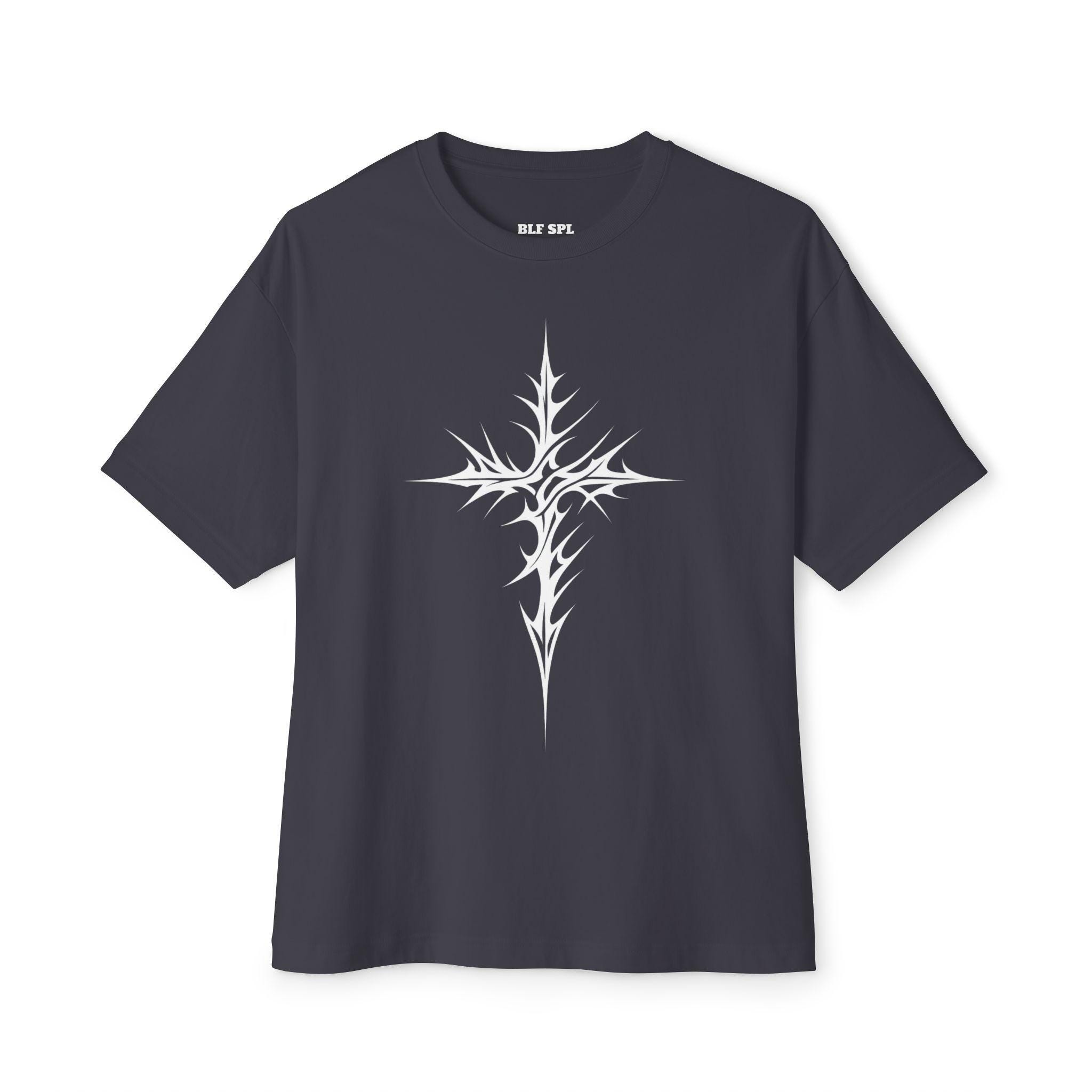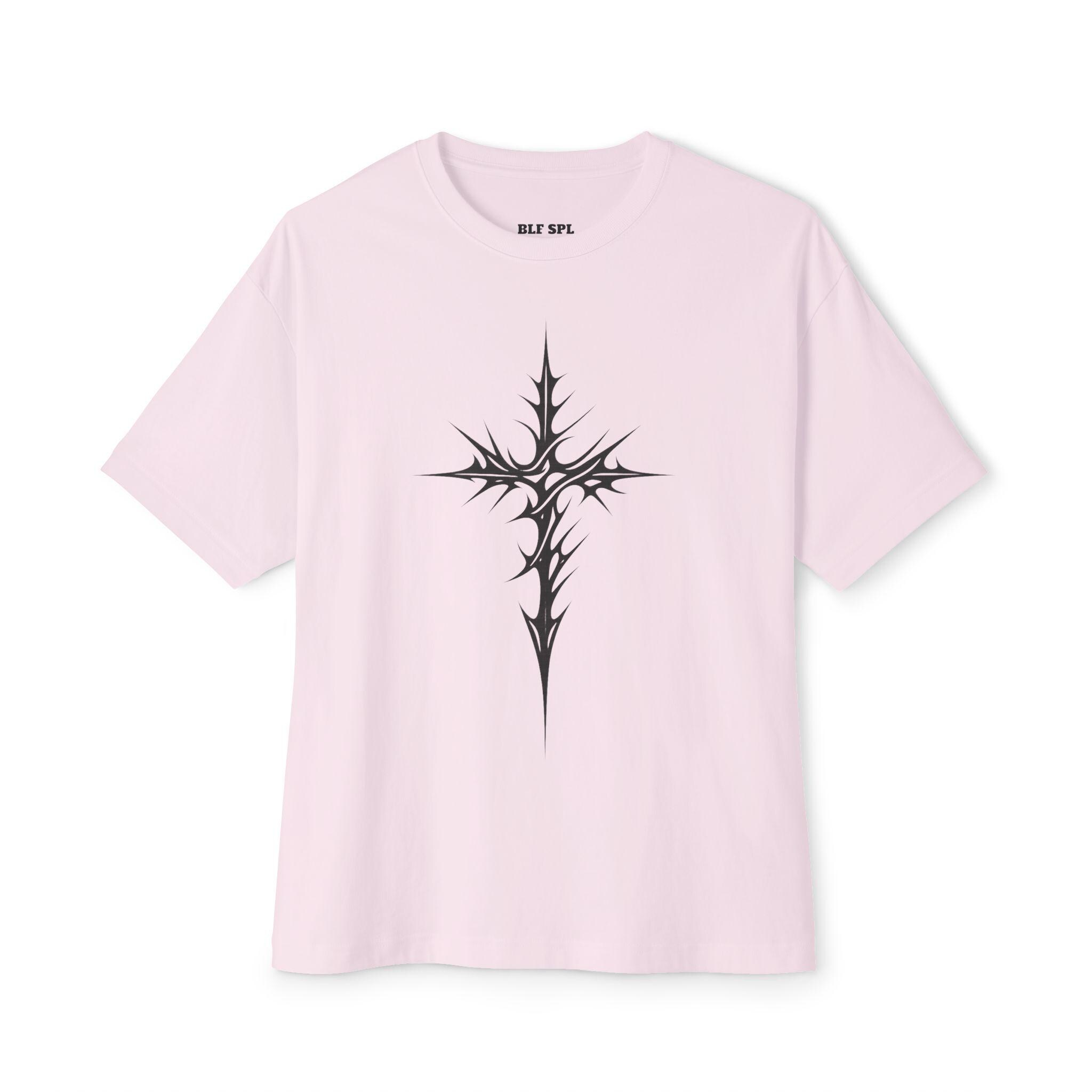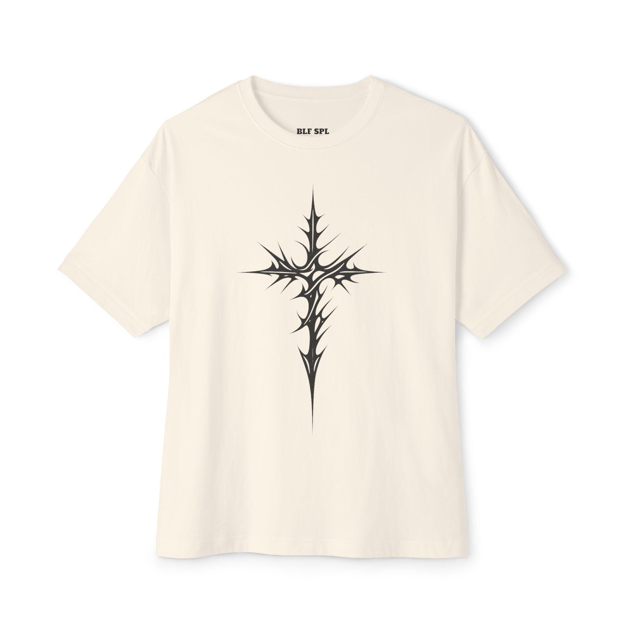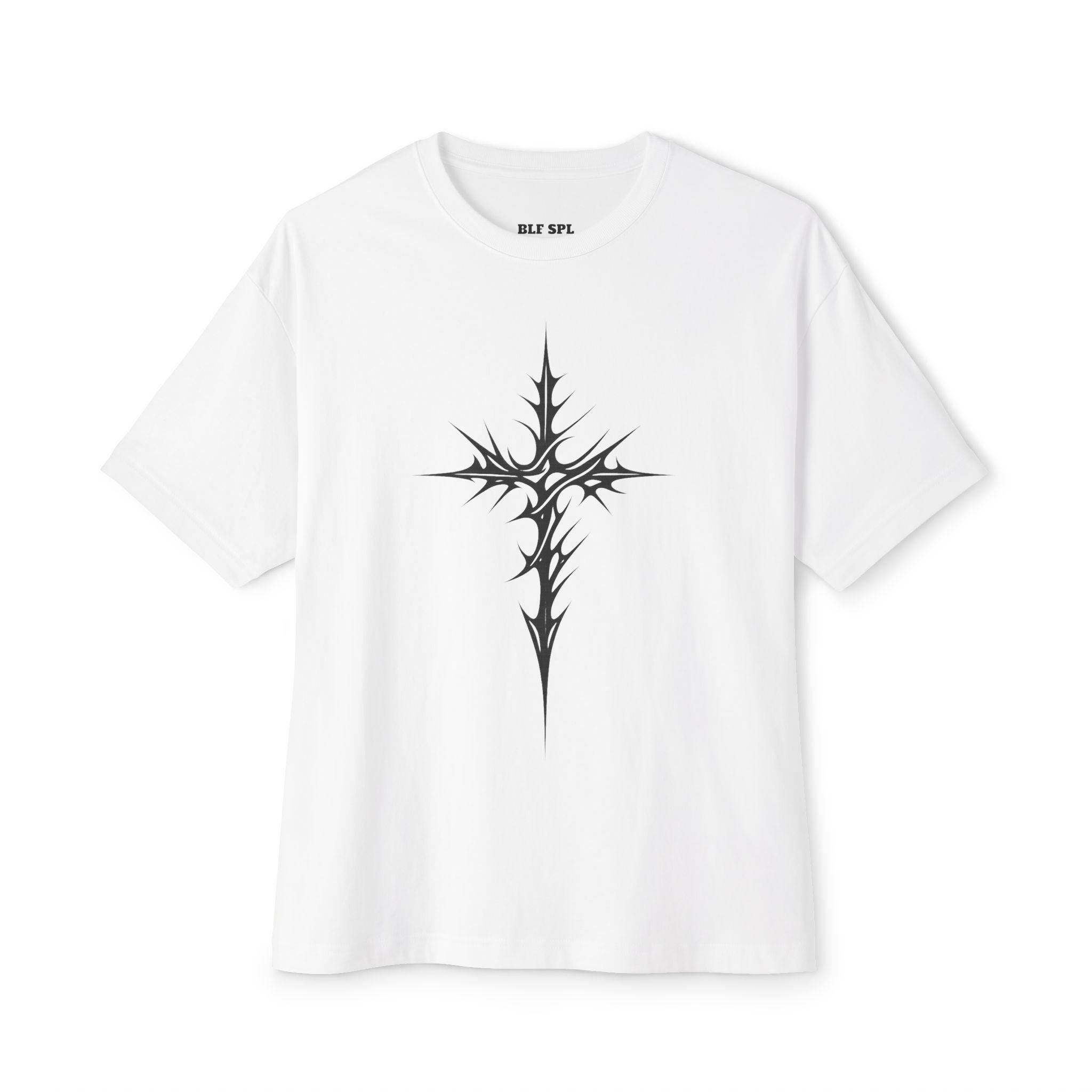 A relaxed, oversized tee that carries quiet edge. The sculpted thorn-cross graphic sits centered on soft white cotton, a single striking motif that reads like worn ink on a favorite shirt. The dropped shoulders and roomy cut let the fabric hang loose — easy to layer over a long-sleeve or wear alone on warm days. It moves with you: mornings at the coffee shop, late-night walks under streetlights, or when you want something simple that still says something. The medium-weight cotton has a lived-in feel without being heavy, and the tear-away label keeps the neck comfortable for all-day wear. This tee blends minimalist symbolism with an offbeat, slightly gothic vibe for anyone who prefers subtle statements to loud logos.