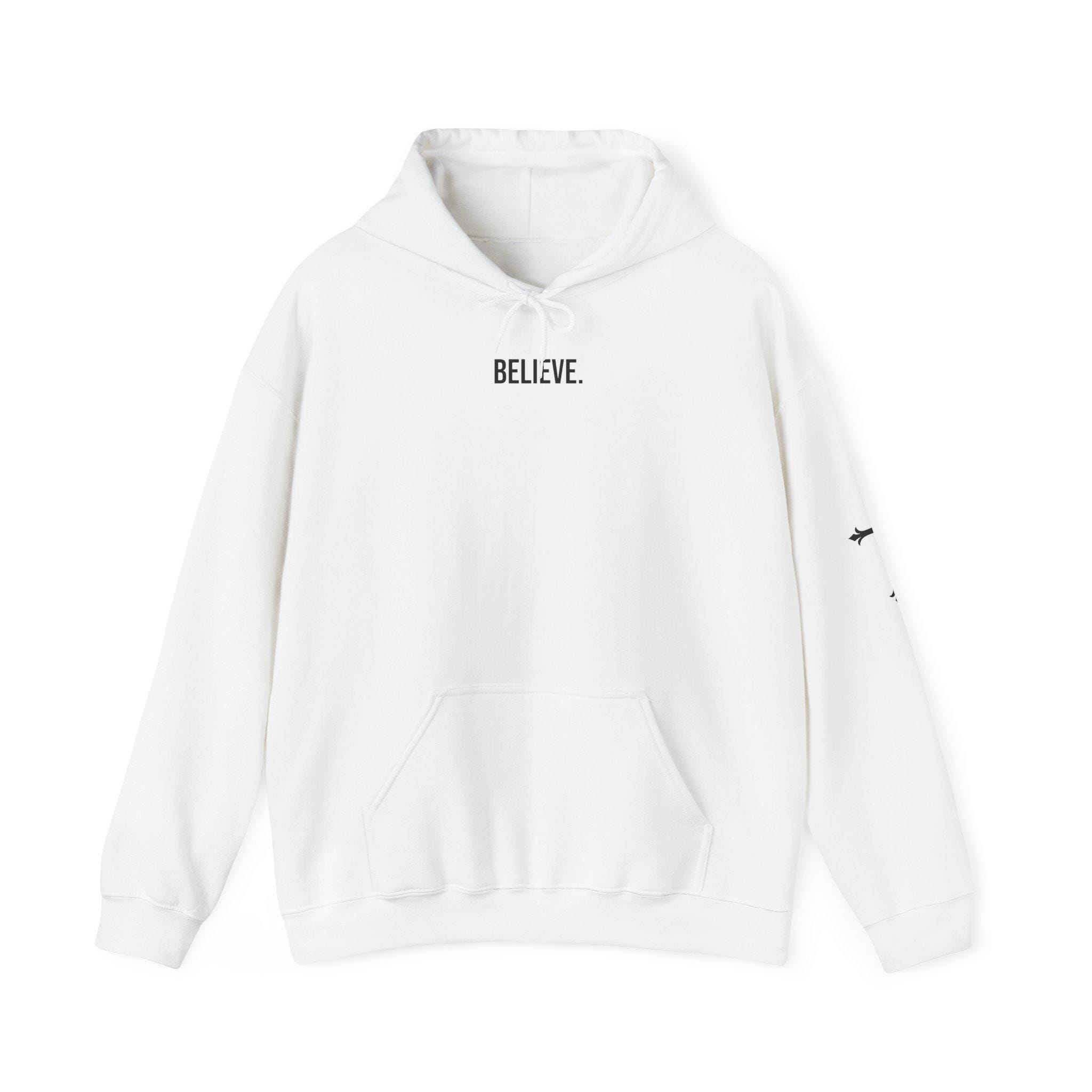 A soft, mid-weight hoodie designed for quiet confidence and everyday wear. The clean white fleece wears a small, understated “BELIEVE.” script on the chest and a simple cross motif along the sleeve — subtle symbols that feel personal, not loud. The roomy kangaroo pocket and double-lined hood add warmth and familiarity; the smooth 50/50 cotton–poly blend keeps the print crisp and the fabric resilient through repeated wear. This hoodie settles into your daily rhythm — for morning coffee, late-night walks, or folded on the chair as a calm reminder to keep going.