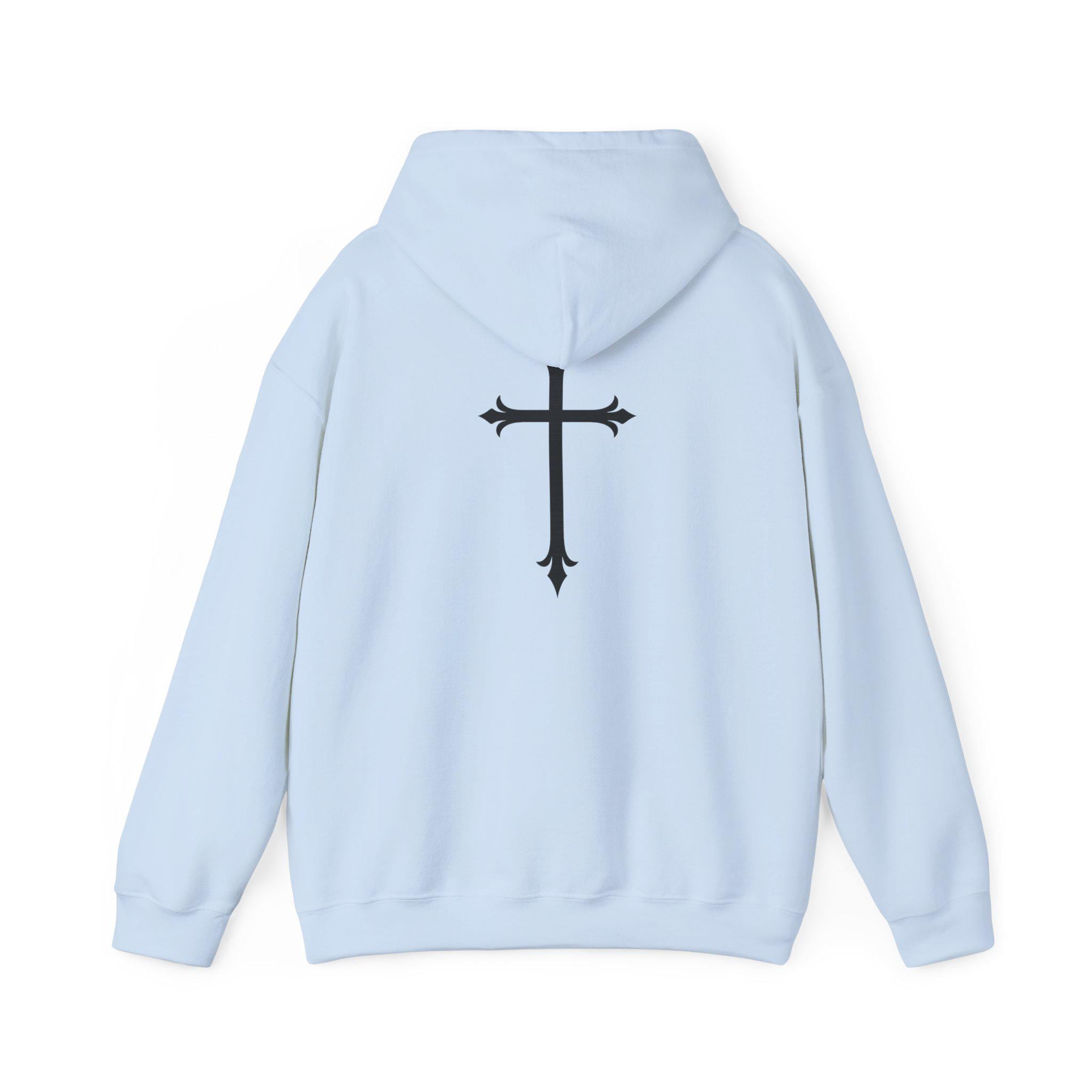 A soft, roomy hoodie designed for quiet moments and quiet strength. The washed-light blue knit wears in gently and keeps movement easy, while the minimalist black cross at the back reads like a small, steady statement. Wear it when you need warmth and calm—mornings with coffee, long drives, or evenings spent at fellowship or reflection. The simple, tiny front text sits near the collarbone, subtle and intentional, while the double-lined hood and color-matched drawcord add a finished look. Pouch pocket and medium-heavy fabric hold up through repeated wear, and the smooth cotton/poly blend keeps prints crisp and shapes relaxed. This is a hoodie made to be lived in—soft against the skin, durable in the wash, and quiet in its faith-forward design.