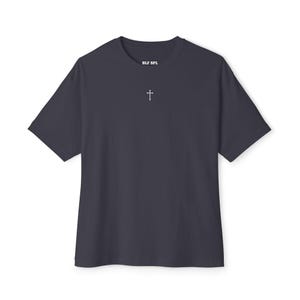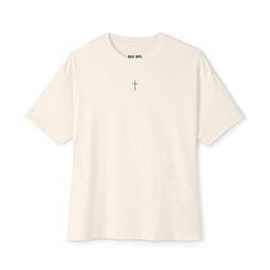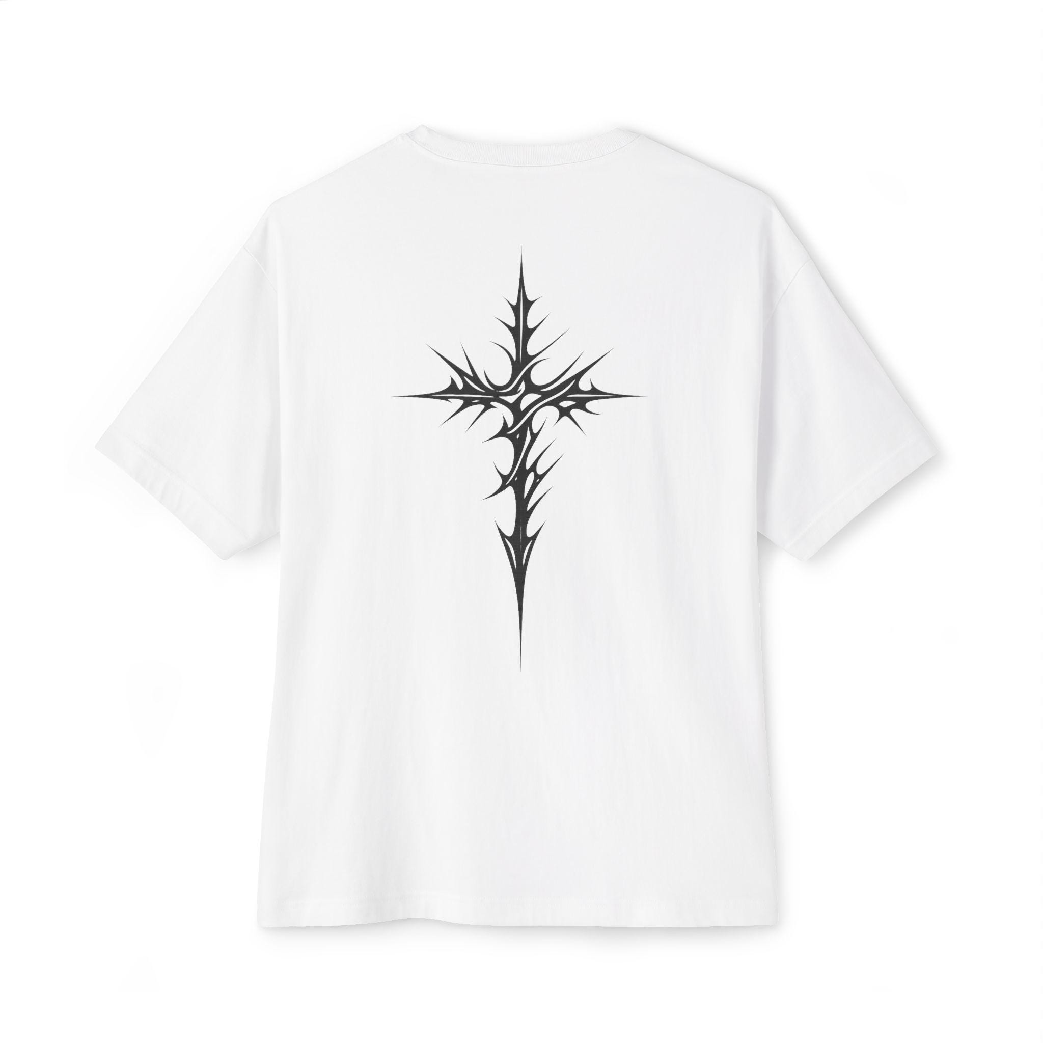 This oversized boxy tee brings quiet edge to everyday wear. The soft, mid-weight cotton drapes with relaxed dropped shoulders, giving a casual, lived-in silhouette that still reads intentional. A stark, spiky cross print sits on the back—minimal but arresting—so the shirt reads like a statement when you move, not a shout. Wear it layered over a long-sleeve for cool evenings or alone when you want the graphic to be the focus. It settles into your rotation quickly: comfortable, durable, and expressive without trying too hard.