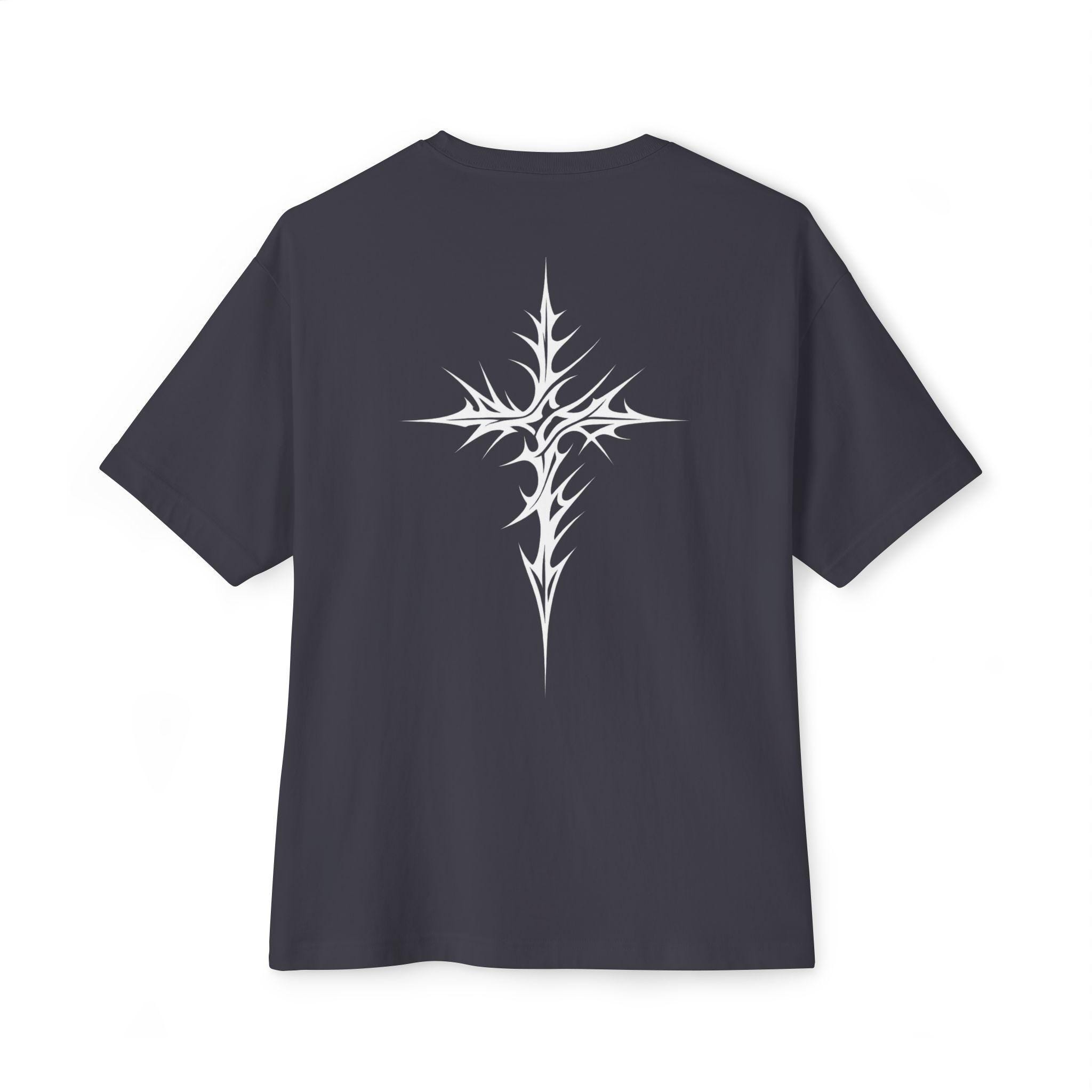 A relaxed, boxy tee designed for comfort and quiet style. The medium-weight cotton feels soft and sturdy, with dropped shoulders that create an easy, lived-in silhouette. On the back, a sharp, tribal-inspired cross adds an edgy, spiritual touch — subtle from a distance, detailed up close. Wear it with jeans, layered under a jacket, or on slow weekend mornings when you want clothing that’s simple but expressive. The muted charcoal tone keeps the look low-key while the back graphic speaks to personal meaning and bold, minimalist aesthetics.