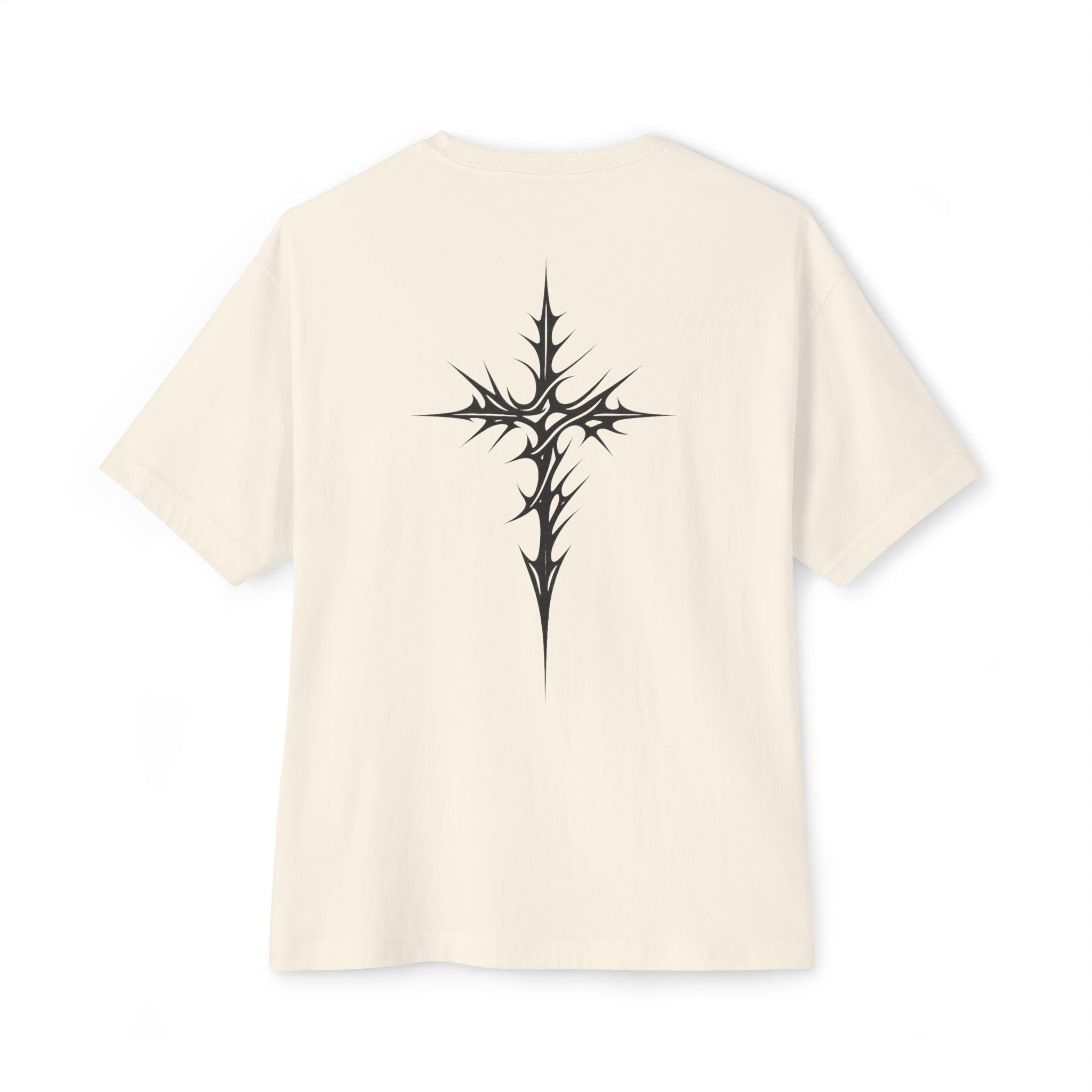 This oversized boxy tee carries a raw, quiet edge — soft natural cotton with a bold, thorn-like cross printed low on the back. It settles loosely over the shoulders, sleeves hanging with that relaxed, lived-in silhouette that invites slow walks, late-night coffee runs, and layering under an open shirt or jacket. The neutral, off-white fabric keeps the focus on the stark black graphic: angular, slightly aggressive lines that feel handcrafted and personal. Wear it when you want to move through the day without fuss but still say something subtle about who you are.