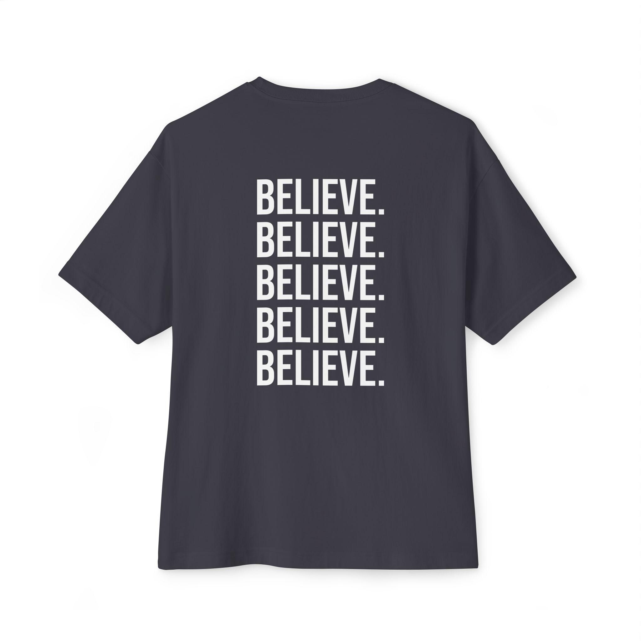 A relaxed, oversized tee built for quiet confidence and everyday wear. The front bears a tiny centered cross near the collar — a subtle nod to faith — while the back repeats the word “BELIEVE.” in bold, stacked type. The silhouette sits with dropped shoulders and a roomy body that moves with you, not against you. Wear it on slow Sunday mornings, to community meet-ups, or layered under a jacket for city nights. The tone is calm and steady — this is clothing that speaks softly about what matters to you without shouting. The medium-weight cotton has enough structure to hold the print while staying breathable, so it drifts between seasons and routines with ease.